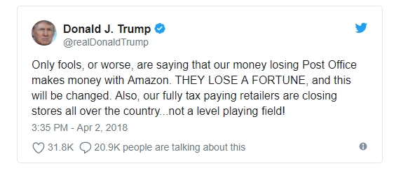 Ésta es la segunda vez que Donald Trump la emprende contra Amazon en poco menos de una semana. Concretamente, la semana pasada utilizó su cuenta de Twitter para criticar la política de impuestos de Amazon asegurando que “a diferencia de otros, ellos pagan pocos o ningún impuesto a los gobiernos estatales y locales, utilizan nuestro Servicio Postal como su chico de reparto, causando una tremenda pérdida a Estados Unidos, y están poniendo a miles de minoristas fuera del negocio”.