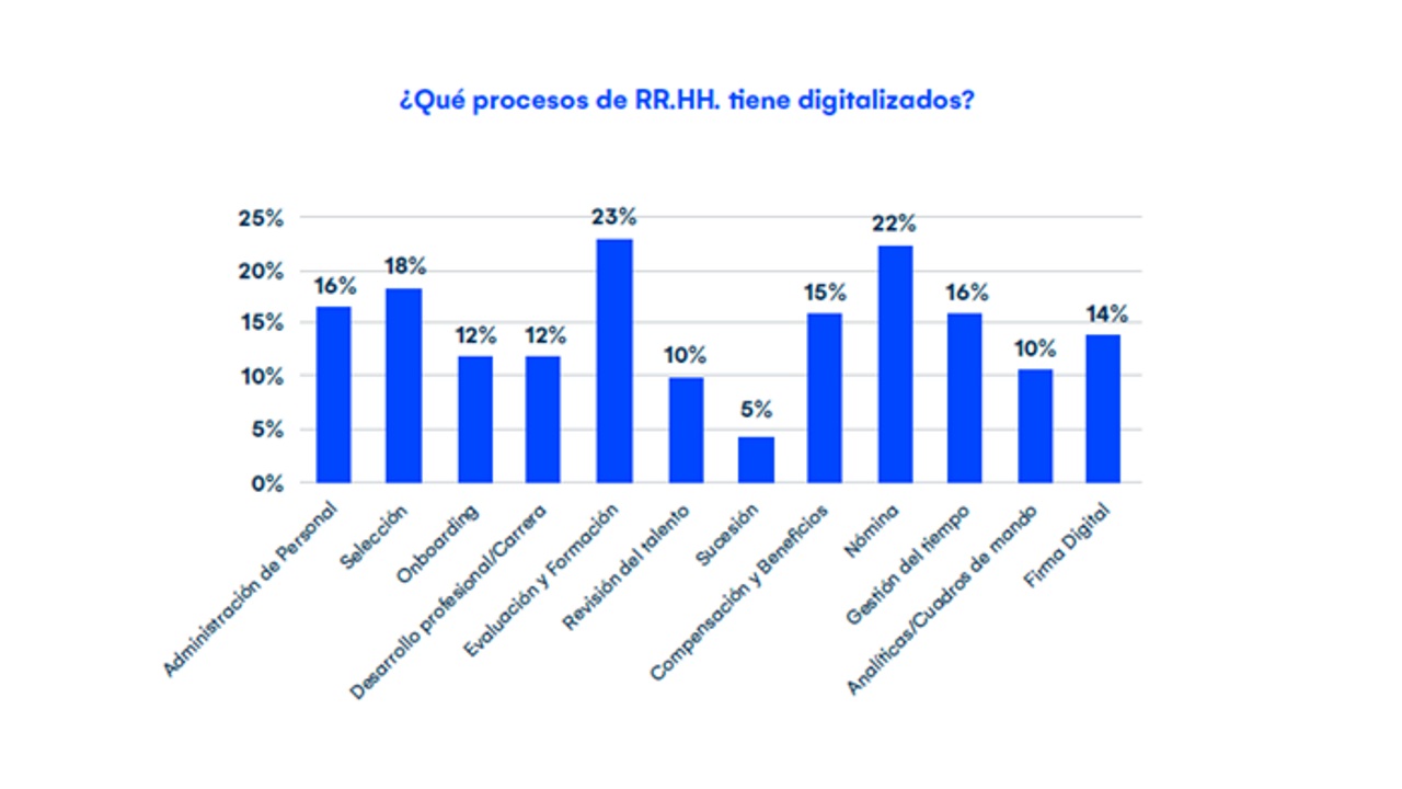 A pesar de la aceleración digital experimentada en los últimos meses debido a los efectos de la pandemia, el informe muestra que tan solo el 33% de empresas españolas cuenta con un plan definido y unos objetivos marcados para la digitalización de los procesos de RR.HH. Pese a ello, el estudio muestra que tienen unos procesos más digitalizados, como es el caso de los de Evaluación y Formación (23%) y Nómina (22%), seguidos de los de Selección (18%), Administración de Personal y Gestión del Tiempo (16%) y Compensación y Beneficios (15%). En el vagón de cola se encuentran los planes de sucesión (5%), seguidos de Revisión de Talento y analíticas/cuadros de mando (10%), Onboarding y Desarrollo de Carreras (12%) y Firma Digital (14%).