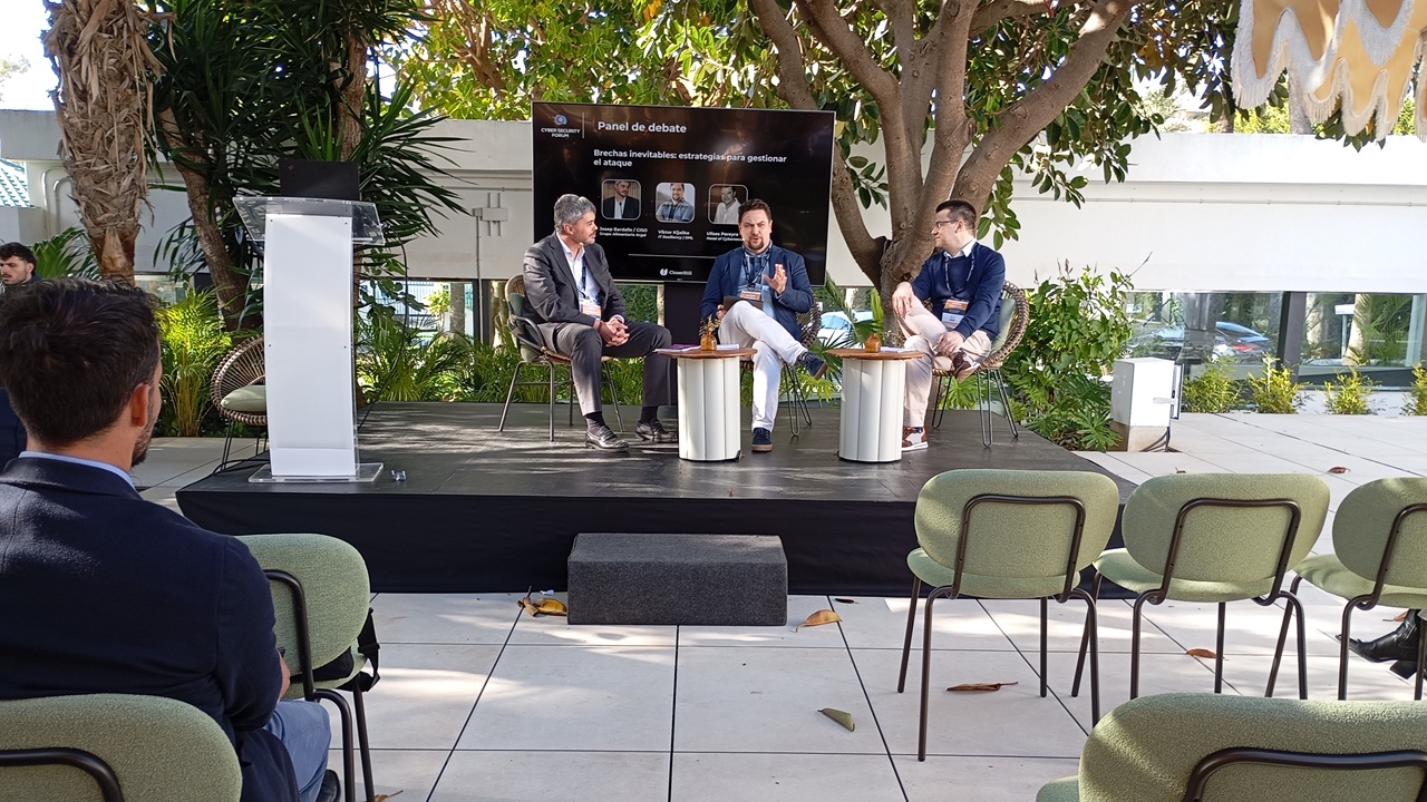 Josep Bardallo, CISO de Grupo Argal, Viktor Kijaško, especialista en resiliencia tecnológica de DHL, y Ulises Pereyra, Head of Cybersecurity de Nestlé, en la mesa redonda “Brechas inevitables: estrategias para gestionar el ataque”.