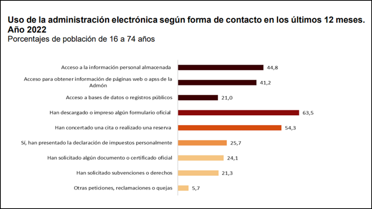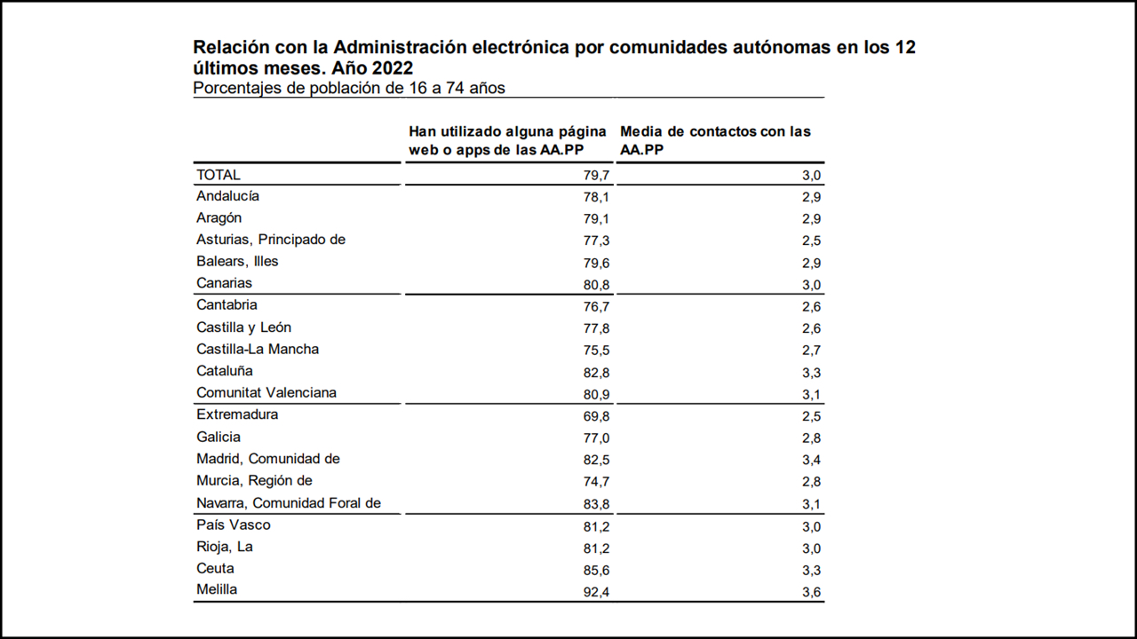 En el ámbito de la administración electrónica, la encuesta refleja que casi 8 de cada 10 personas de 16 a 74 años han contactado o interactuado con las administraciones o servicios públicos a través de Internet en los 12 últimos meses por motivos particulares. Esto supone un incremento de 11,0 puntos respecto a 2021. Por edad, interactúan en mayor proporción los de 25 a 54 años. Por sexo, apenas se aprecian diferencias.