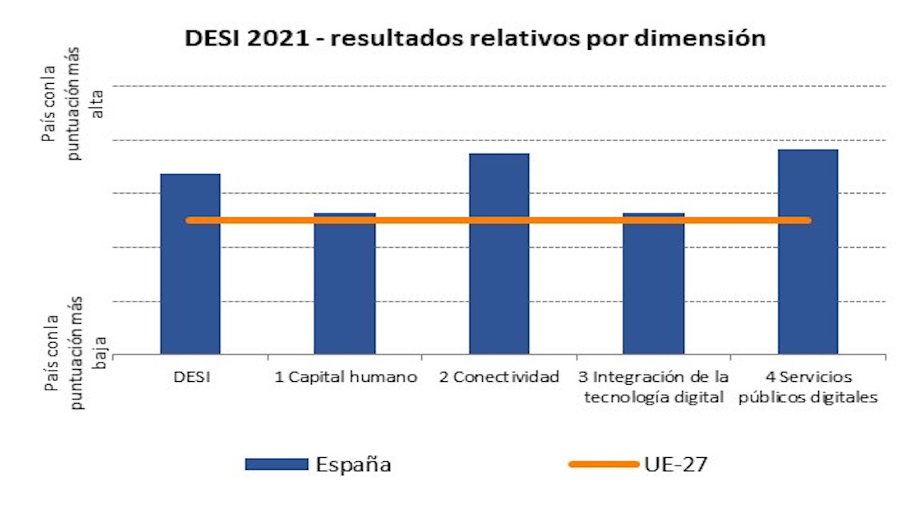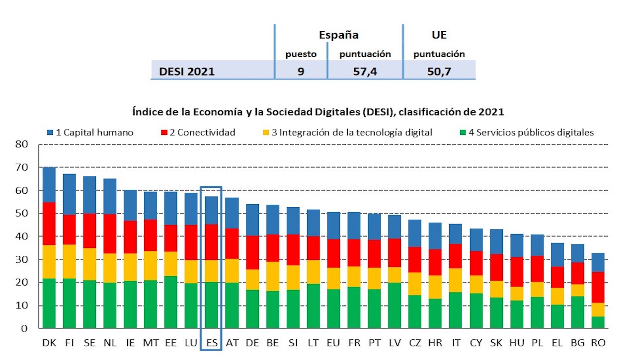 El índice DESI (Digital Economy and Society Index), publicado durante el 2021 en el marco de la Comisión Europea para seguir los progresos de los Estados miembros de la UE en materia de competitividad digital, coloca a España en 9º lugar, mejorando dos posiciones con respecto al año anterior.