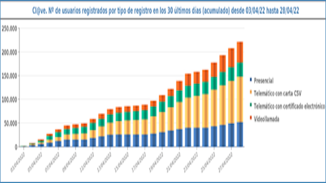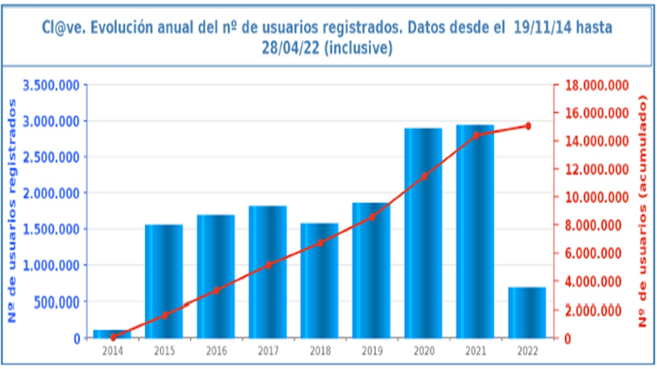 Durante el mes de abril de 2022, Cl@ve, la plataforma de identificación para las Administraciones Públicas, superó los quince millones de usuarios registrados desde sus inicios. El sistema también continúa con la tendencia alcista en cuanto al número de peticiones de acceso desde los proveedores de servicio, llegando a ser más de 123 millones como dato acumulado en los últimos 30 días.