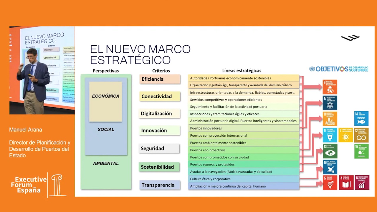 Respecto a la línea específica enfocada a la digitalización, llamada Administración portuaria digital. Puertos inteligentes y sincromodales, Arana presentó otros cinco objetivos de gestión: