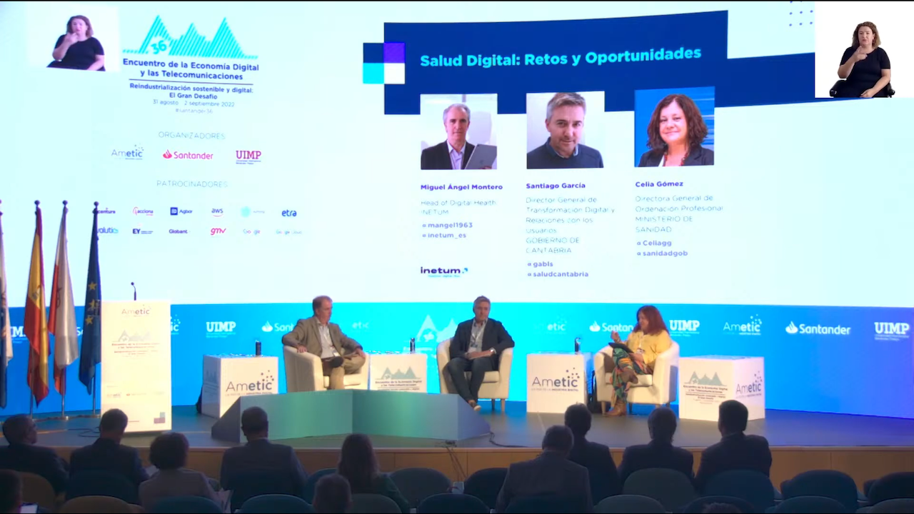 Estas palabras introductorias de Celia Gómez, Directora General de Ordenación Profesional, Ministerio de Sanidad, tuvieron su continuación en la intervención de Santiago García, Director General de Tranformación Digital y Relaciones con los Usuarios del Gobierno de Cantabria, quien quiso destacar tres retos en el ámbito de la Salud donde las TIC son ya muy importantes: