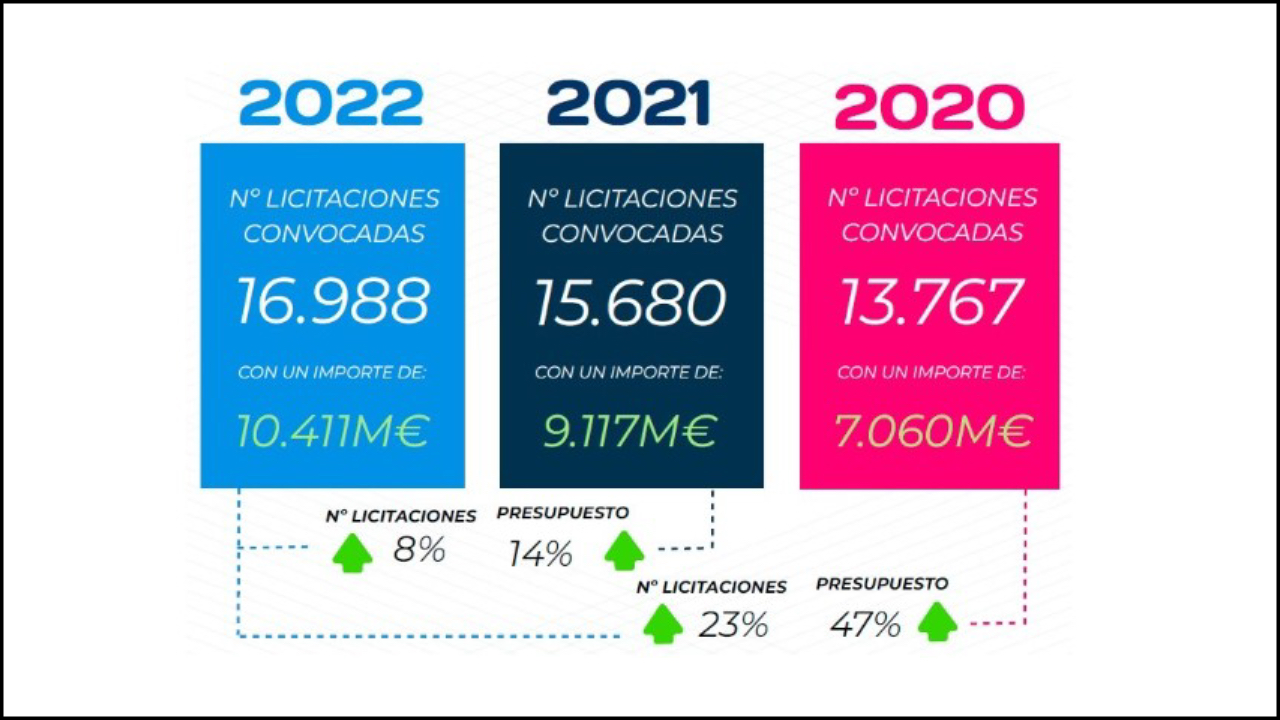 El esfuerzo del sector público por mantenerse en la vanguardia tecnológica ha conducido a millonarias inversiones. En 2022, la Administración española convocó 16.988 licitaciones públicas destinadas a potenciar los sistemas y servicios informáticos y de telecomunicaciones, un 8% más que en la totalidad del 2021 (15.680 concursos públicos). La situación se acentúa en comparación con 2020, cuando se registraron 13.767 concursos, un 23% menos.